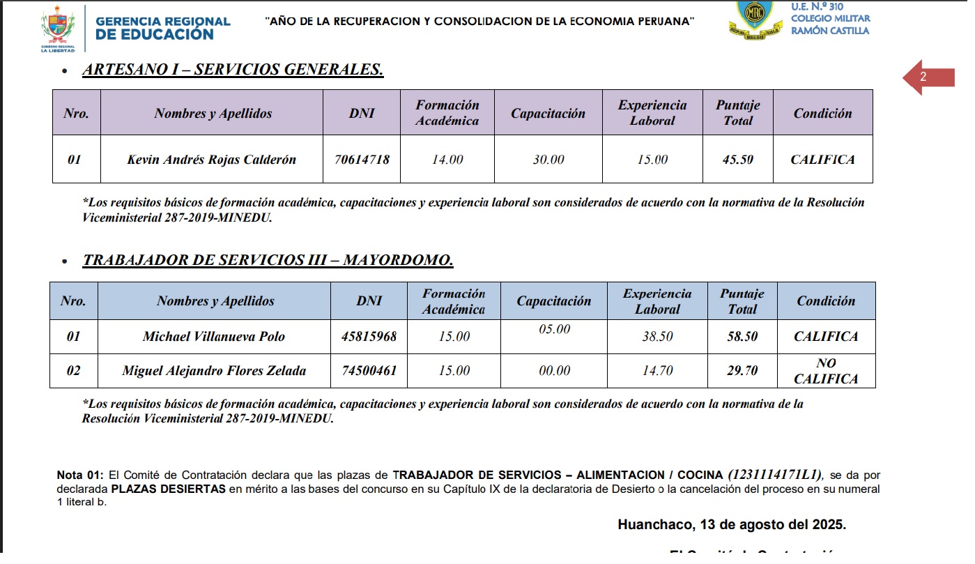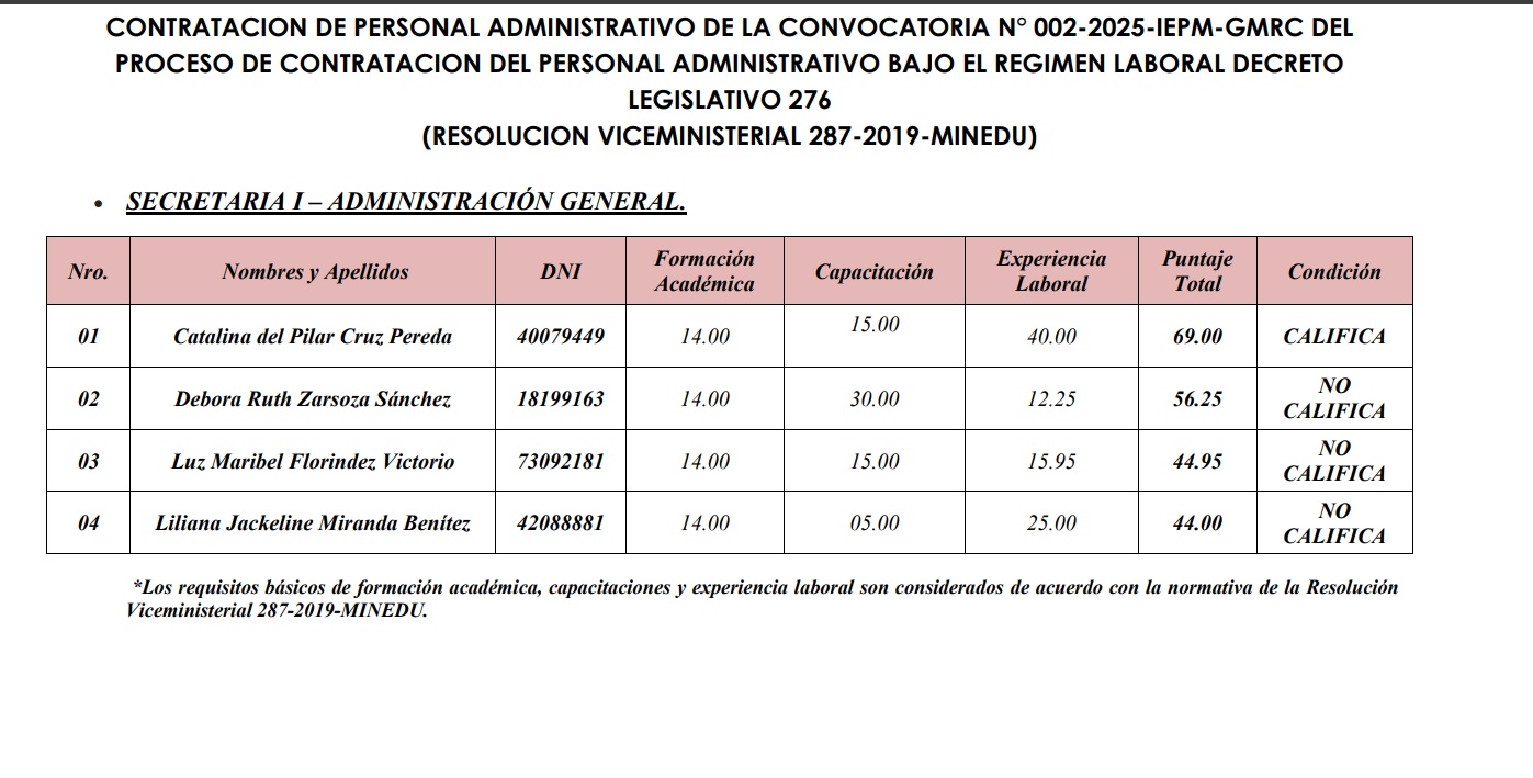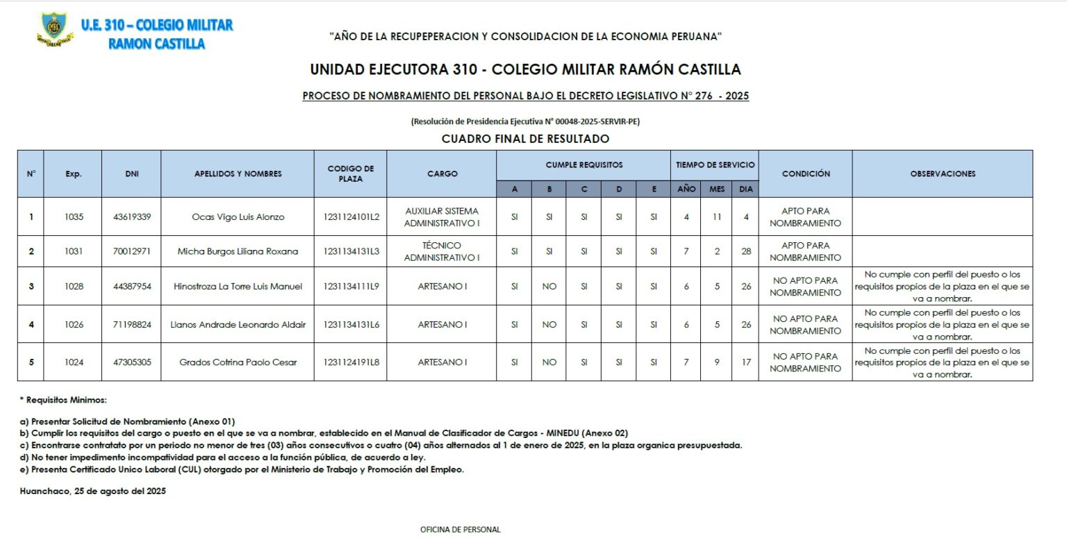 RESULTADOS FINALES DEL PROCESO DE NOMBRAMIENTO DE PERSONAL ADMINISTRATIVO DEL D. LEG. Nº 276 - 2025 UNIDAD EJECUTORA 310 - COLEGIO MILITAR RAMON CASTILLA